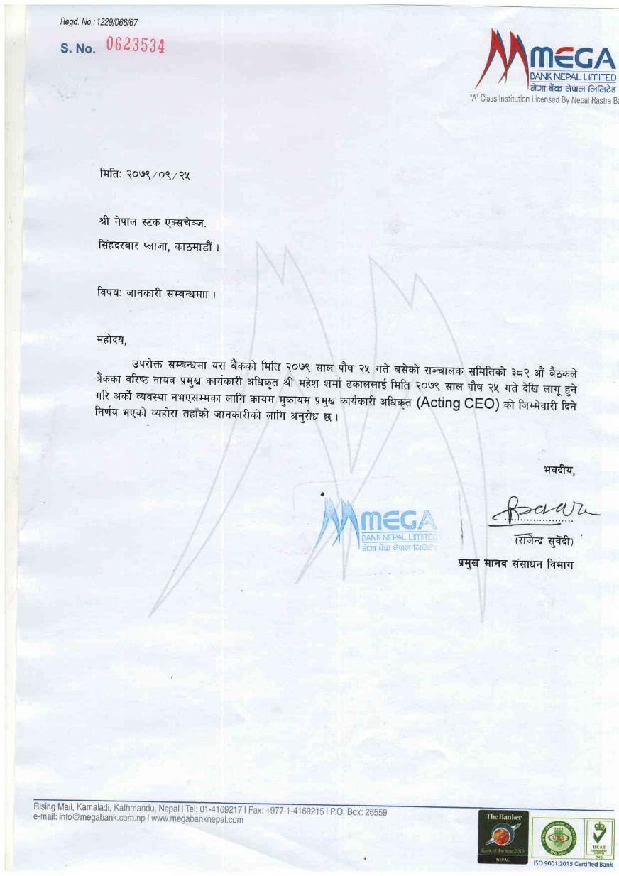 बैंकको पुष २५ गते बसेको संचालक समितिको बैठकले बरिष्ठ नायब प्रमुख कार्यकारी अधिकृत ढकाललाई पुष २५ गतेदेखि नै लागू हुने गरी अर्को व्यवस्था नभएसम्मको लागि कामु सिइओको जिम्मेवारी दिने निर्णय गरेको हो ।