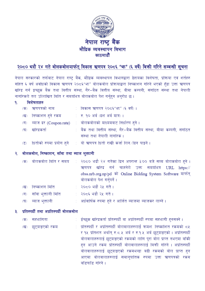 उक्त ऋणपत्र पर्सि आइतबार बोलकबोलमार्फत बिक्री गरिने जनाएको छ। यस ऋणपत्रमा इच्छुक बैंक तथा वित्तीय संस्था, गैरबैंक वित्तीय संस्था, बीमा कम्पनी, संगठित संस्था तथा नेपाली नागरिकले बोलपत्र पेस गर्न सक्नेछन्।