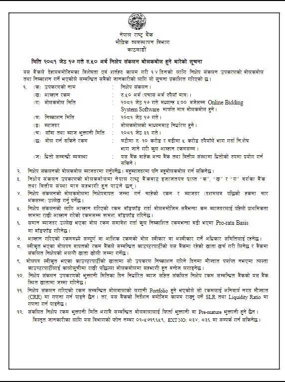 इच्छुक  बैंक तथा वित्तीय  संस्थाले  आज दिउँसो ३ बजेसम्म बोलकबोलमार्फत आवेदन दिन सक्नेछन् ।