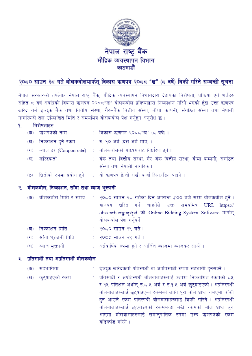 यस ऋणपत्र आज साउन २८ गते बोलकबोल मार्फत बिक्री गरिनेछ। यस ऋणपत्रमा इच्छुक बैंक तथा वित्तीय संस्था, गैरबैंक वित्तीय संस्था, बीमा कम्पनी, संगठित संस्था तथा नेपाली नागरिकले बोलपत्र पेस गर्न सक्ने बैंकले जनाएको छ ।
