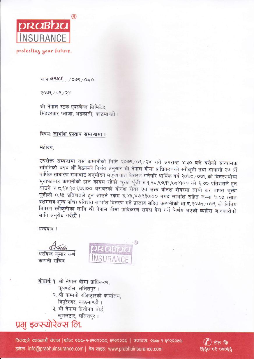 प्रस्तावित लाभांश नेपाल बीमा प्राधिकरणको स्वीकृति पश्चात आगामी २७ औं वार्षिक साधारणसभाबाट अनुमोदन पश्चात वितरण गर्नेछ ।