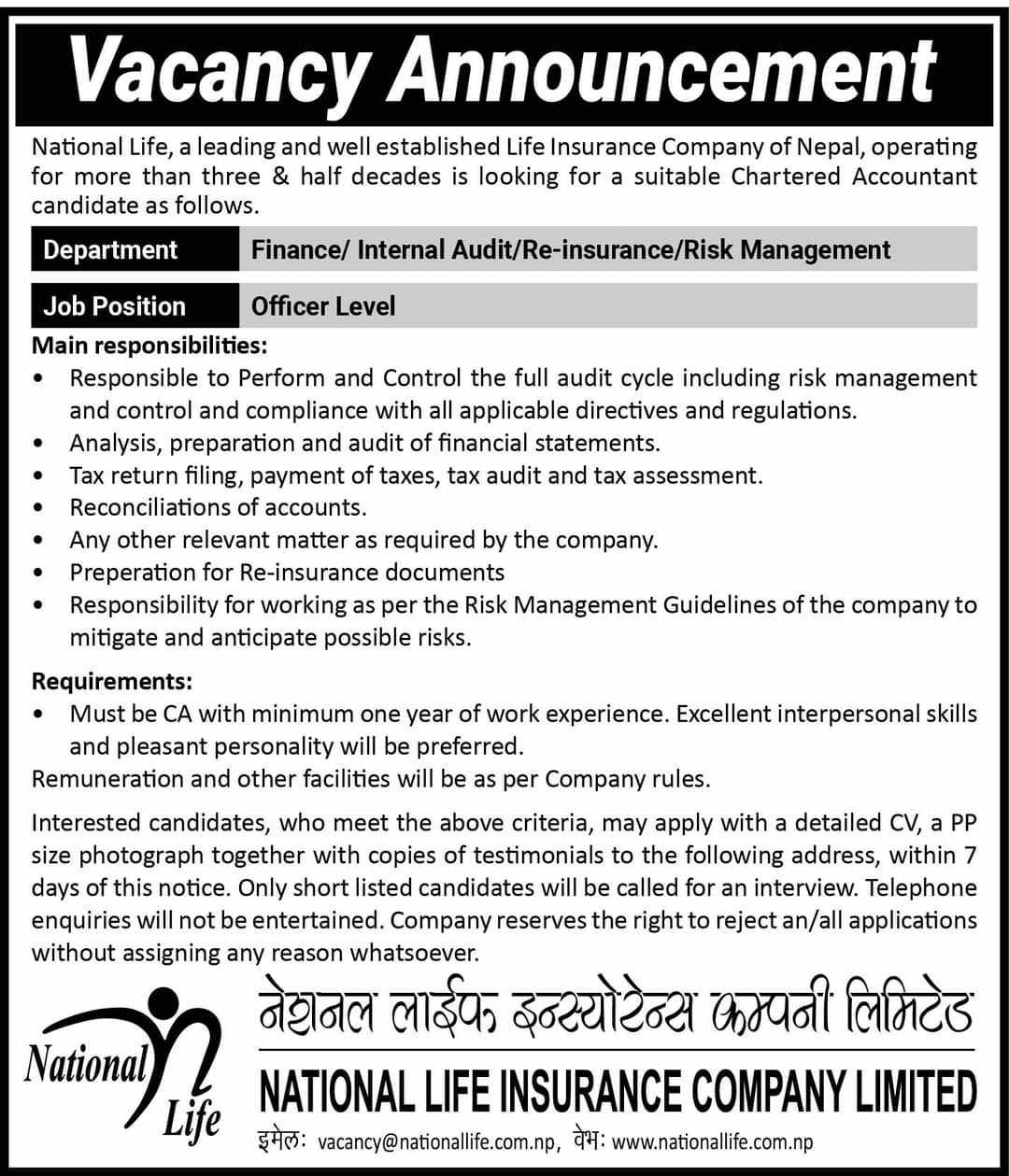 नेशनल लाइफ इन्स्योरेन्समा रोजगारीको अवसर
