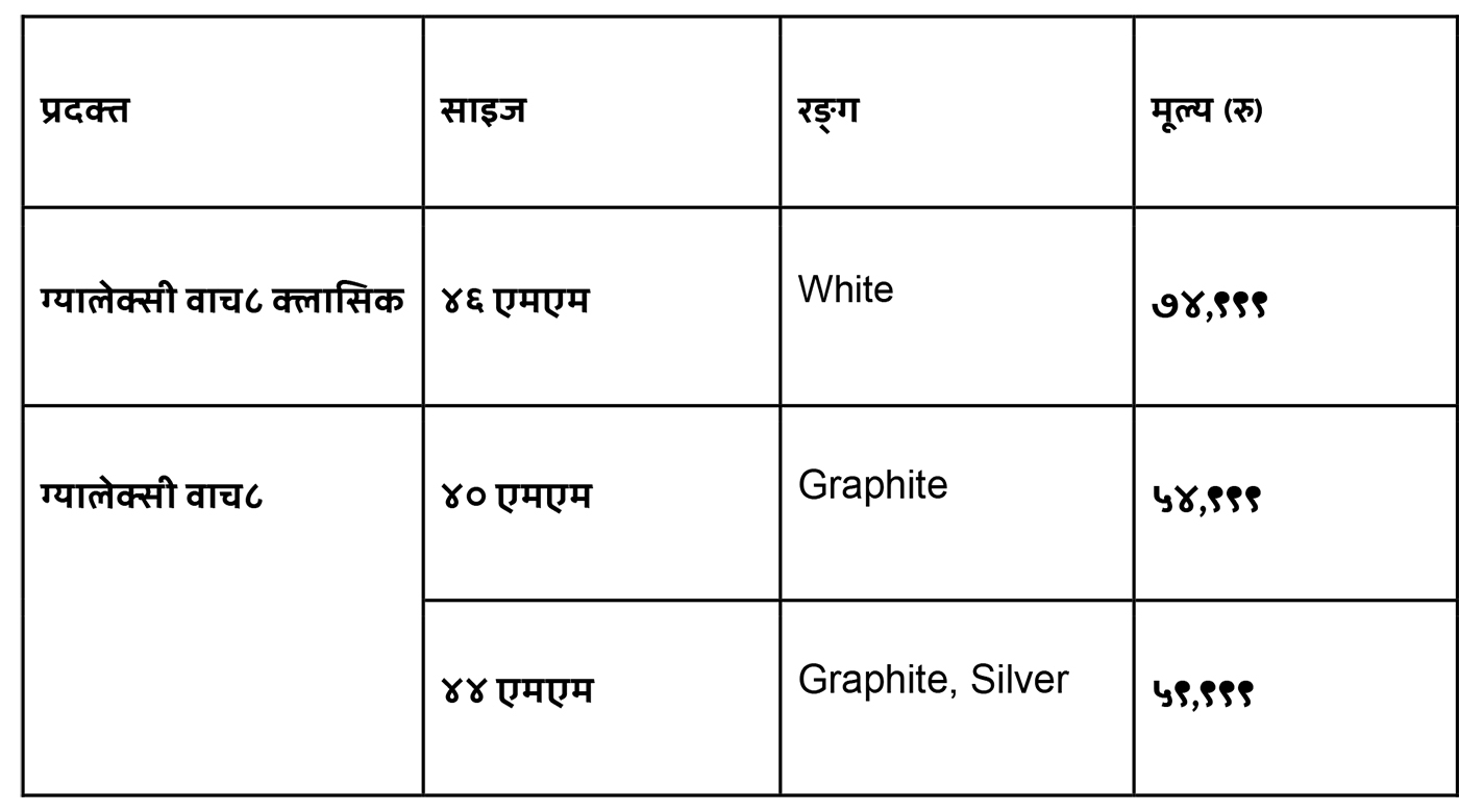 ग्यालेक्सी वाच८ सिरिज तपाईँको हरेक जीवनशैलीसँग मिल्ने गरी तयार गरिएको हो, जसले तपाईँलाई स्वस्थ रहन, जोडी रहन र अझ सन्तुलित जीवनतर्फ सार्थक कदम चाल्न प्रेरित गर्दछ।