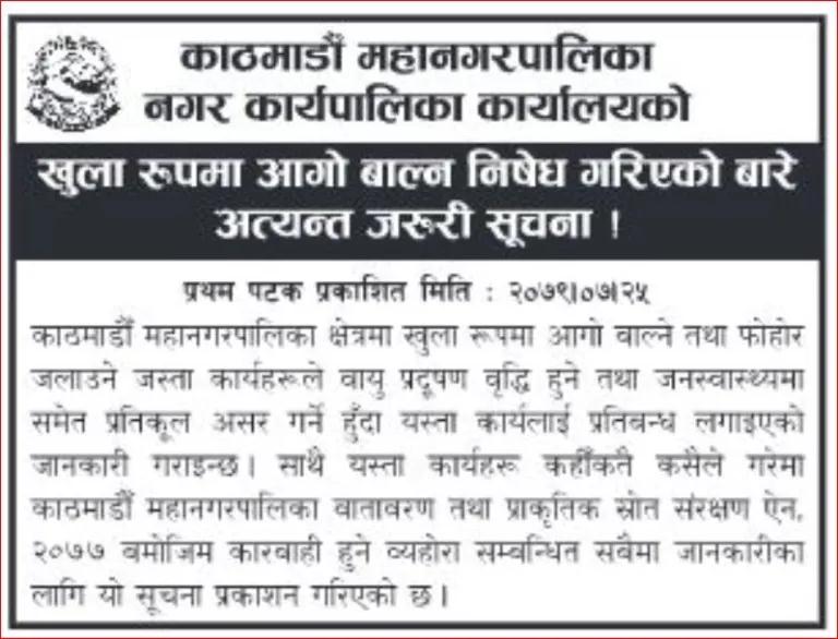 खुला रुपमा आगो बाल्ने तथा फोहर जलाउने जस्ता गतिविधिले वायु प्रदूषण बढ्ने तथा जनस्वास्थ्यमा पनि असर गर्ने हुँदा प्रतिबन्ध लगाएको सूचनामा उल्लेख छ ।