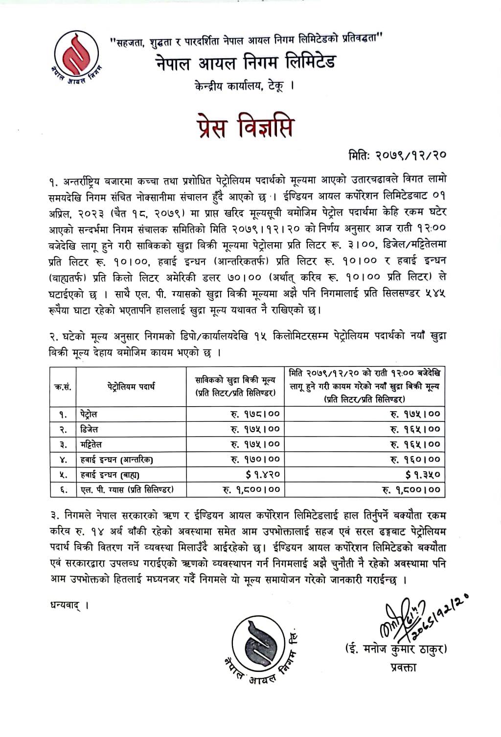 भारतीय आयल कर्पोरेसन (आईओसी) ले अप्रिल १ २०२३ मा नयाँ मूल्यसूची पठाएको थियो। नयाँ मूल्यसूची अनुसार पेट्रोलमा प्रतिलिटर रू.१.८६ र डिजेलमा रू.६.८२ पैसा घटेर आएको थियो।