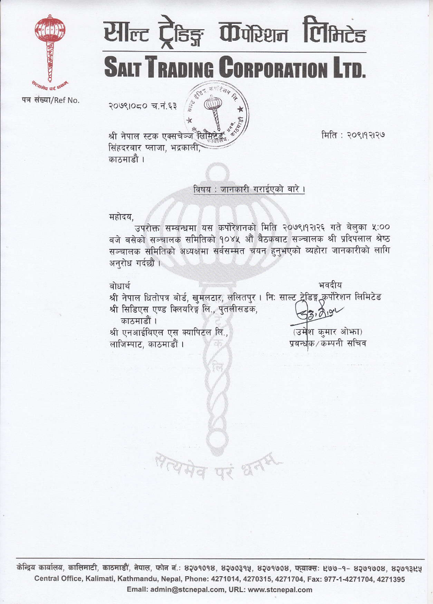 काठमाडौँ । साल्ट ट्रेडिङ कर्पोरेसन लिमिटेडको अध्यक्षमा प्रदीपलाल श्रेष्ठलाई नियुक्त गरिएको छ । हिजो चैत्र २७ गते सोमबार बसेको लिमिटेडको सञ्चालक समितिको बैठकले कर्पोरेसनकै सञ्चालकको रुपमा काम गर्दै आएका प्रदीपलाल श्रेष्ठलाई अध्यक्षमा नियुक्त गर्ने निर्णय गरेको थियो ।