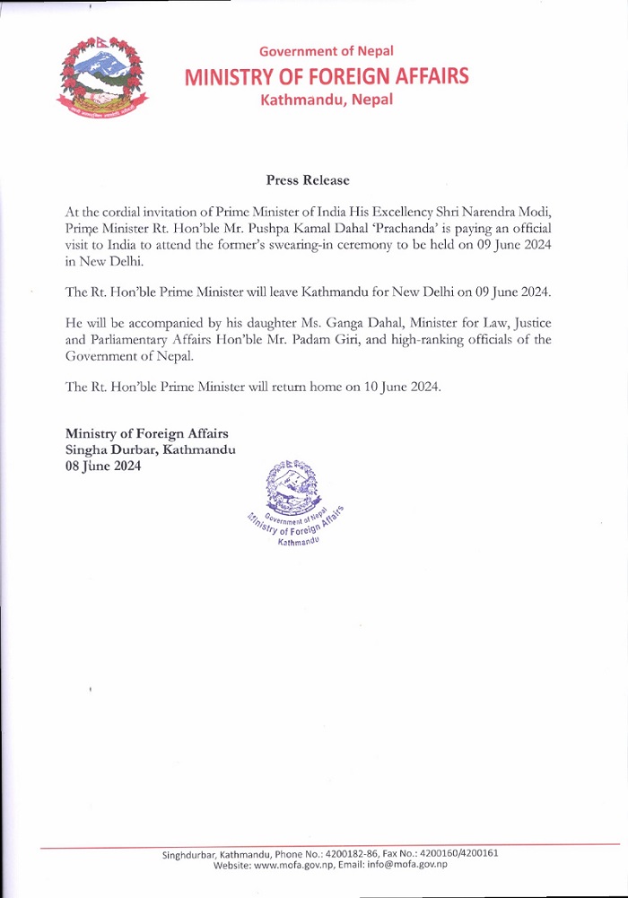 परराष्ट्र मन्त्रालयले एक विज्ञप्ती निकालेर भारतीय प्रधानमन्त्री मोदीको हार्दिक निमन्त्रणामा प्रधानमन्त्री प्रचण्ड भोलि भारत जाने र पर्सि फर्किने जनाएाको छ ।