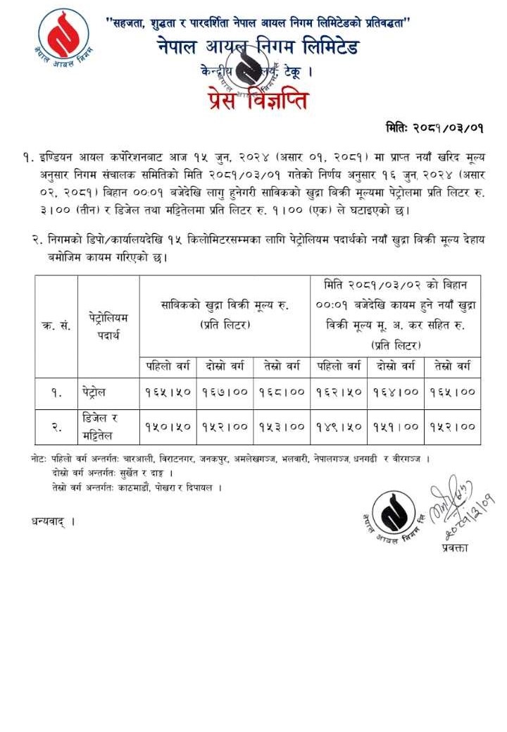 त्यस्तै डिजल र मट्टीतेलमा काठमाडौँ, पोखरा र दिपायल वरपर प्रतिलिटर १५२, सुर्खेत र दाङ वरपर १५१ र चारआली, विराटनगर, जनकपुर, अमलेखगञ्ज, भलबारी, नेपालगञ्ज, धनगढी र वीरगञ्ज वरपर १४९ रुपैयाँ कायम भएको छ ।