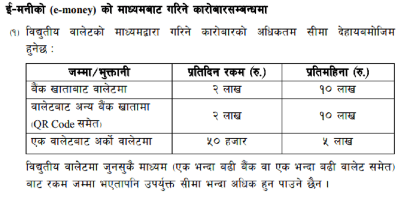 डिजिटल वालेटका हकमा भने बैंक खाताबाट वालेटमा दैनिक २ लाख र मासिक १० लाख रुपैयाँसम्म पठाउन सकिने सीमा तोकिएको छ । साथै, एउटा वालेटबाट अर्को वालेटमा हुने कारोबारमा दैनिक ५० हजार र मासिक ५ लाख रुपैयाँको सीमा कायम गरिएको छ ।