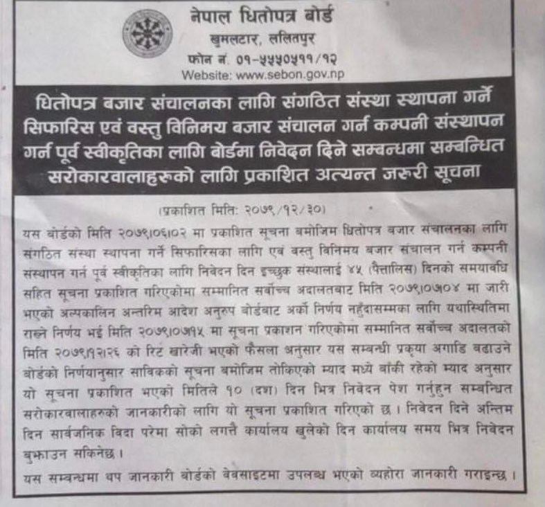 सर्वोच्चले नयाँ स्टक एक्सचेन्जको लाइसेन्स दिने बाटो खुलाएपछि बोर्डले इच्छुक कम्पनीलाई आवेदन दिन सार्वजनिक सूचना जारी गरेको छ । सर्वोच्चले रोक लगाउनुअघि नै बोर्डले लाइसेन्स खुलाएको थियो । त्यो बेला सार्वजनिक सूचना जारी गरेको ३५ दिन भएको थियो ।